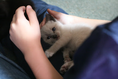 Still not sure if this kitten is a boy or a girl, but Justin kept calling it "white one". I fell in love with a black and white one - but we will not be bringing one of them home - no way, no how! We will pet them, love them, and help find them loving homes - and that is where it ends!